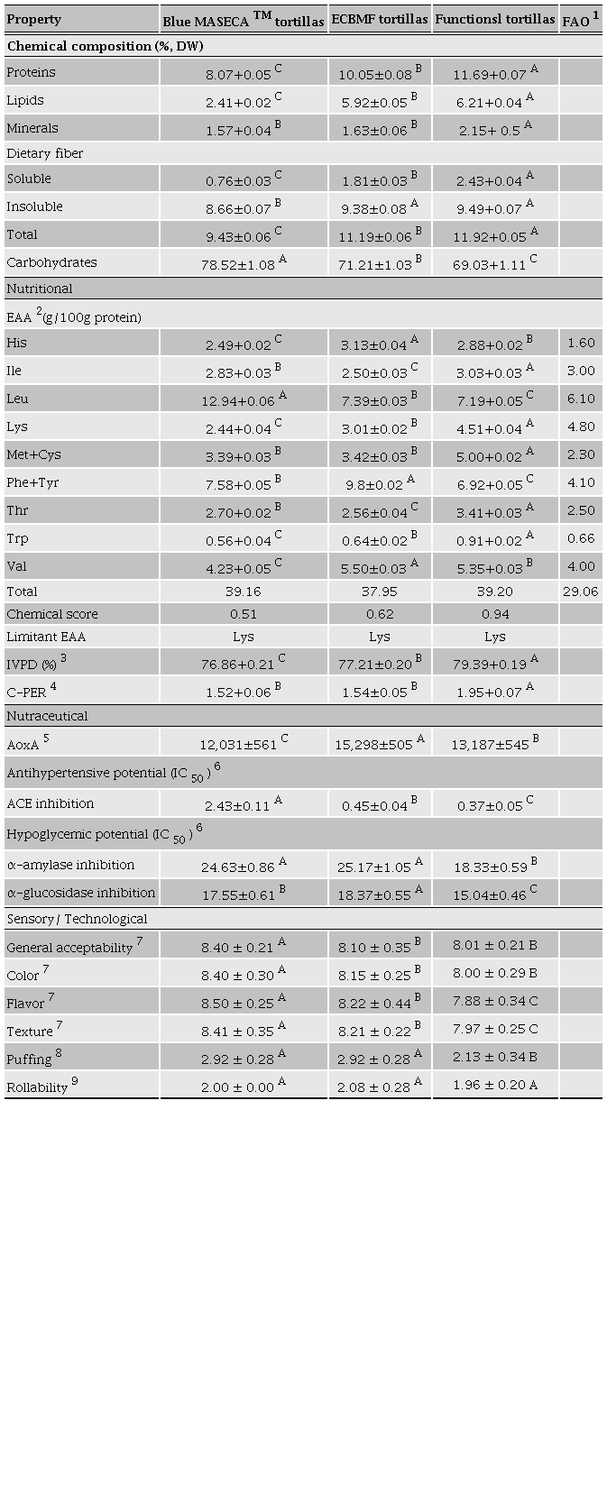 Abstract: Mexico suffers from serious malnutrition, overweight and obesity problems, affecting a large part of the population, as well as, chronic degenerative diseases (CDD), among which cardiovascular diseases (CVD) and diabetes, are the main causes of mortality in the country. The tortilla represents a viable vehicle to improve the Mexicans nutritional status. In the present work, the effect of the addition of 30 % extruded amaranth flour (EAF) on the nutritional [essential amino acid profile (EAA), in vitro protein digestibility (IVPD), calculated protein efficiency ratio (C-PER)], nutraceutical [antioxidant activity (AoxA), and antihypertensive and hypoglycemic potentials] and sensory properties of extruded creole blue maize flour (ECBMF) tortillas were evaluated. The functional tortillas (ECBMF tortillas added with 30 % of EAF) presented more protein, dietary fiber, IVPD and C-PER than tortillas from ECBMF alone; however, they showed lower AoxA (13,187 vs. 15,298 µmol TE / 100 g, DW) and better antihypertensive and hypoglycemic potentials than 100 % ECBMF tortillas. The addition of EAF, resulted in sensorially acceptable functional tortillas with better nutritional and nutraceutical properties. Functional tortillas could reduce malnutrition and chronic degenerative diseases in Mexico.