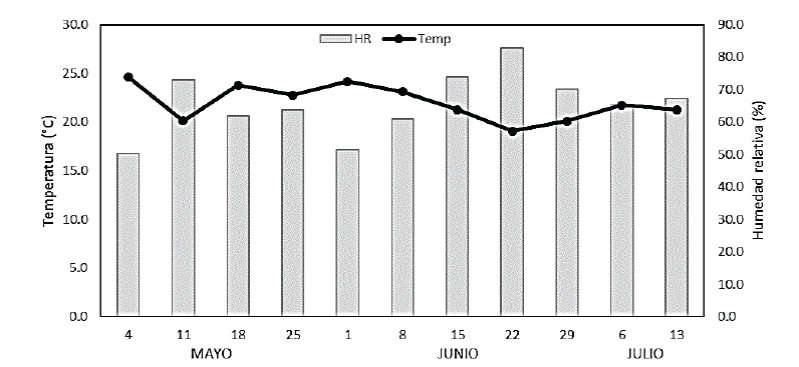 Durante el desarrollo del estudio se registró semanalmente la temperatura media (°C) y humedad relativa (%) dentro del invernadero con un registrador de datos ambientales Hobo Modelo U12 (Onset®).