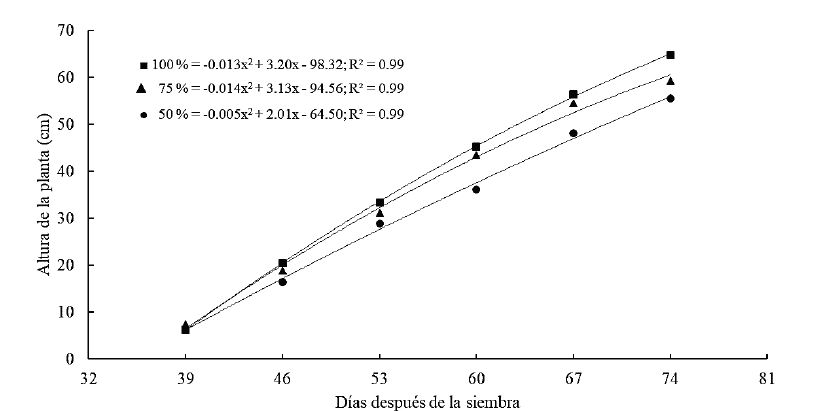A los 74 dds, la concentración de la solución nutritiva de Steiner al 100 % generó la mayor altura de planta (64.7 cm) con un incremento por día de 3.20 cm en comparación con la concentración de 75 % (59.2 cm) y un incremento por día de 3.13 cm ( Figura 2). Es importante señalar, que la solución nutritiva de Steiner al 100 % desde los 46 dds fue superior a la concentración del 50 %, la cual generó una altura de 55.5 cm a los 74 dds. Esto nos indica que la altura de la planta está relacionada con la aportación de los nutrimentos esenciales aplicados en el sustrato, lo que posiblemente promovió un aumento en el alargamiento y división celular ( Azcón-Bieto y Talón, 2008). Huidobro-Medina (2013) reportó altura promedio de 62 cm en plantas de epazote a los 75 dds en condiciones de invernadero. Por otro lado, Blanckaert et al. (2011) encontraron que la altura de epazote osciló de 59 a 109 cm, en etapa vegetativa antes de la floración. En otros cultivos herbáceos, se ha reportado la misma tendencia que la observada en el presente estudio; al respecto, Cruz-Crespo et al. (2017) al evaluar concentraciones de la solución nutritiva de Steiner de 25 a 100 % en cilantro a los 50 ddt, reportaron un incremento en altura de 38.9 a 56.8 cm.