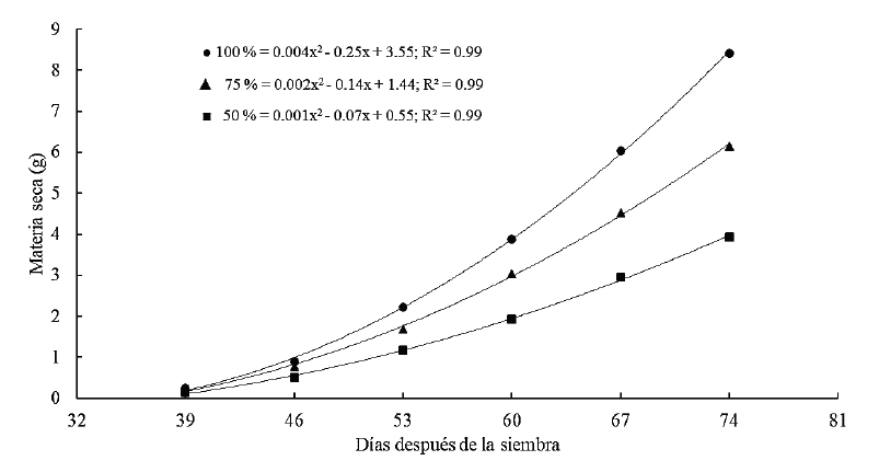 En cuanto a la materia seca, la concentración al 100% presentó el valor más alto (8.42 g por planta) a los 74 dds, en comparación a la solución a 75 y 50 % ( Figura 3). Durante el desarrollo del cultivo, la materia seca por planta presentó un crecimiento progresivo en función del incremento de la solución nutritiva. Las tendencias de la materia seca en las tres concentraciones se ajustaron a un modelo cuadrático. Así, la producción de materia seca por planta por día fue de 0.25 g para la concentración de 100 %, el cual superó a las concentraciones de 75 y 50 % en 0.14 y 0.07 g, respectivamente. Lo anterior, indica que la generación de materia seca está directamente relacionada con la disponibilidad y aprovechamiento de los nutrimentos en el suelo o en el medio de cultivo, con lo cual, resulta una mejor actividad fotosintética ( Azcón-Bieto y Talón, 2008). Al respecto, Huidobro-Medina (2013) reportaron materia seca de 9.7 g de epazote a los 75 dds, esos resultados son aproximados a los obtenidos con la concentración de 100 % del presente estudio. Blanckaert et al. (2011) reportaron valores mayores de materia seca de epazote (18.18 g), esto posiblemente a las condiciones en que se desarrolló el cultivo, así como del genotipo utilizado. Los resultados obtenidos son similares a los reportados por Cruz-Crespo et al. (2017) , quienes encontraron que la solución nutritiva Steiner a 100 % de concentración generó el mayor peso seco en plantas de cilantro, durante su crecimiento.
