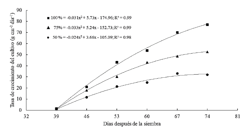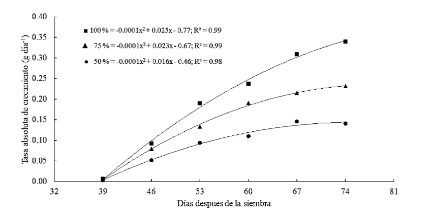 En la tasa absoluta de crecimiento se observó que la más alta acumulación de materia seca por día se presentó a los 74 dds ( Figura 5), con la solución nutritiva de Steiner al 100 % (0.340 g día -1), en comparación con la concentración al 75 % (0.232 g día -1) y al 50 % (0.140 g día -1). La TAC se ajustó a un modelo polinómico de segundo grado, donde con la concentración al 100 % se incrementó el peso de la materia seca en 0.025 g día -1, lo que indica una mayor acumulación de materia seca, debido a un mejor aprovechamiento de los recursos nutrimentales, y esto a su vez, se relaciona con un incremento en el dosel vegetal.