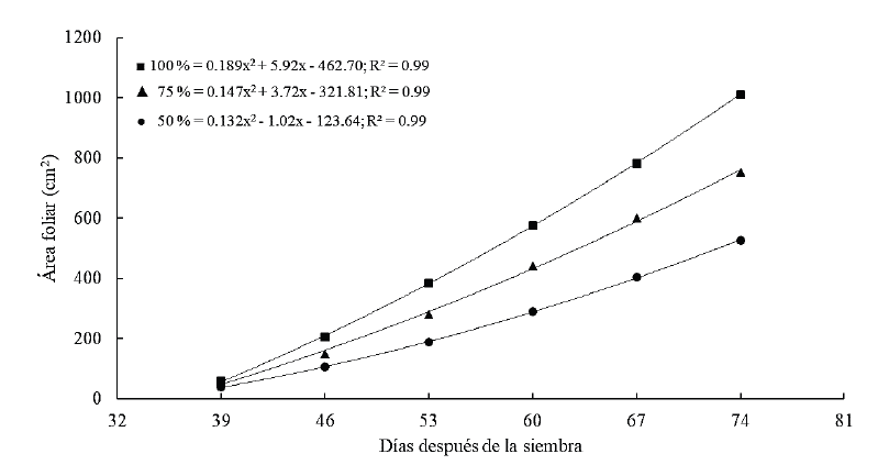 El área foliar se afectó positivamente a medida que se aumentaron las concentraciones de la solución nutritiva ( Figura 6). Esta respuesta en las tres soluciones se ajustó a un modelo cuadrático. Puede apreciarse que, en la concentración a 100 %, se produjo la mayor área foliar por día (5.92 cm 2 día -1), respecto a la concentración a 75 % (3.72 cm 2día -1) y a 50 % (1.02 cm 2 día -1). Esta respuesta está asociada al estado nutrimental de la planta, el cual promovió un aumento en el aparato fotosintético, y en consecuencia una mayor formación de hojas. Cabe señalar, que la máxima expansión foliar se pudo observar a los 74 dds con la solución nutritiva al 100% (1,011.9 cm 2). Estos resultados coinciden con lo reportado por Huidobro-Medina (2013) quien al aplicar la solución nutritiva Hidro-FESI encontraron área foliar promedio de 992 cm 2 en plantas de epazote cultivadas en condiciones de invernadero.