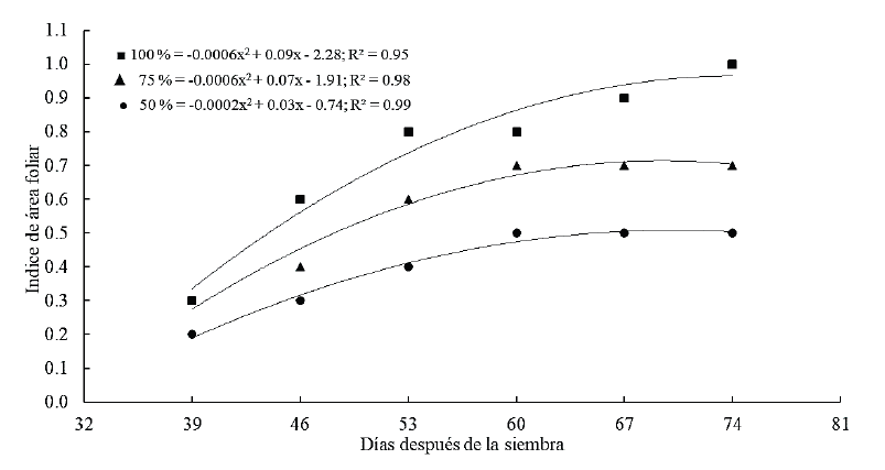 En cuanto al índice de área foliar (IAF), al aplicar la concentración a 100 % se observó un IAF de 1.0 a los 74 dds, siendo el más alto en comparación a las concentraciones de 75 % y de 50 % ( Figura 7). Los menores IAF durante el ciclo de cultivo fueron obtenidos con la solución Steiner al 50 %, donde el IAF fue de 0.5 desde los 60 hasta los 74 dds, la concentración y periodo antes mencionado fue superado por la solución nutritiva al 100% con un IAF (0.6) desde los 53 dds, lo que indica que la disponibilidad de los nutrimentos favoreció el incremento en la producción del área foliar por unidad de superficie de suelo en un periodo más corto. Fghire et al. (2017) en plantas de Chenopodium quinoa reportó IAF entre 1.9 a 3.13 en diferentes genotipos, estas diferencias se deben principalmente a los genotipos utilizados.