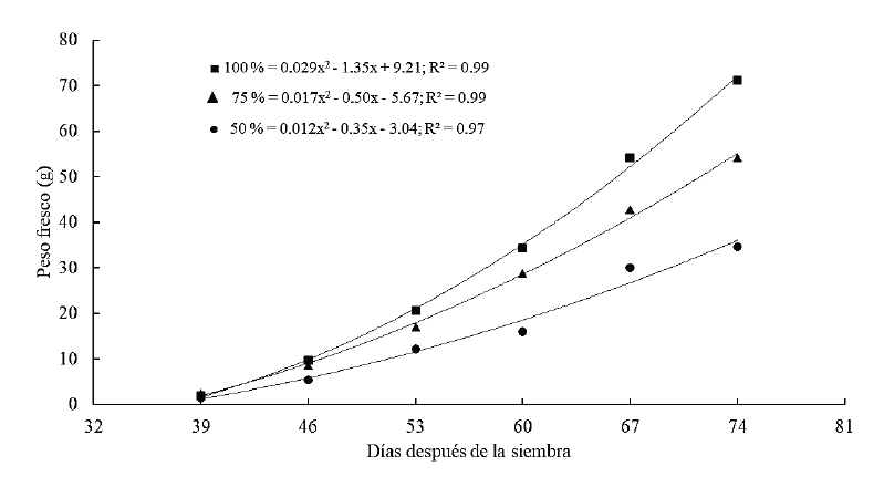 El valor más alto de eso de materia fresca, ( Figura 8), se obtuvo a los 74 dds con la concentración de 100 % (71.2 g por planta), seguido de la concentración al 75 % (54.1 g por planta) y la de 50 % (34.7 g por planta). Esto indica que a medida que se incrementó la concentración de la solución nutritiva también se obtuvo una mejor producción en el peso fresco del cultivo. Dicha respuesta está determinada por un aumento en el dosel vegetal estimulado por la solución Steiner que produce un efecto en la expansión foliar. Al respecto, Cruz-Crespo et al. (2017) indican que a medida que se incrementa la concentración de la solución Steiner también aumenta la materia fresca en plantas de cilantro, y reportaron la mayor biomasa fresca con la concentración al 100 %, a los 90 dds. En contraste, Juárez-Rosete et al. (2019) encontraron que al aplicar el 100 % de la solución Steiner, el peso fresco en orégano disminuyó en comparación al 75 %, lo cual fue atribuido a una excesiva nutrición que induce limitaciones de absorción nutrimental, lo que dificulta la absorción de iones por la raíz. Estos resultados confirman que las concentraciones de la solución nutritiva pueden afectar de manera diferencial el crecimiento de las plantas, en función de la especie.