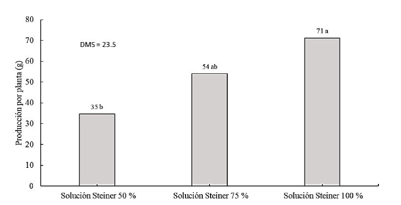 Hubo diferencias ( P ≤ 0.05) en la producción de epazote fresco (g por planta). Las plantas con la mayor producción se obtuvieron cuando se regaron con la solución Steiner a 100% ( Figura 9). Cabe señalar, que a medida que se incrementó la concentración de la solución nutritiva, también la producción por planta aumentó. Esta respuesta puede atribuirse a una mayor disponibilidad y aprovechamiento nutrimental, lo cual influyó directamente sobre la producción de la planta de epazote, como también se ha reportado en cilantro cultivado en tezontle y con solución nutritiva de Steiner ( Cruz-Crespo et al., 2017 ).