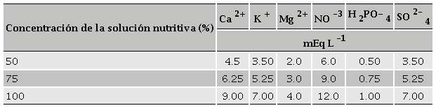 Los tratamientos fueron concentraciones: 50, 75 y 100 % de la solución nutritiva de Steiner (1984) ( Tabla 1). El diseño experimental fue completamente al azar con nueve repeticiones. La unidad experimental estuvo conformada por seis macetas de polietileno color negro de 5 L de capacidad, llenadas con tezontle como sustrato, con granulometría de 1 a 8 mm.