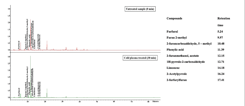 The aroma compounds detected in the untreated roasted coffee and cold plasma treated samples were not statically significant (p > 0.05). A total of 9 volatile compounds were identified in both samples (Figure 1).
