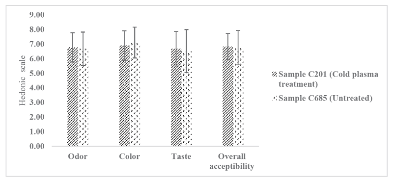 Figure 2 shows the results of a hedonic test of sample C201 (treatment cold plasma) and sample C685 (untreated). The judges evaluated “like moderately” for both samples.