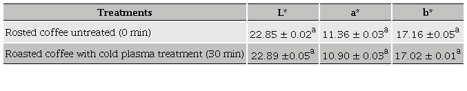 Hunter color parameters for roasted coffee, both treated with cold plasma and untreated, are shown in Table 1. No differences in the surface measured parameters were observed (p > 0.05), and the value of (ΔE of 0.78 was obtained. In conditions of ideal vision, values of (ΔE ≤ 1 represent a minimum difference of color, hardly perceptible for the human eye (Vervoort et al., 2012).