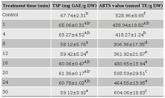 TSP content in roasted coffee showed significant (p < 0.05) variations during the cold plasma treatment, decreasing from 67.74 ( 2.31 GAE/g to 59.12 ( 3.92 GAE/g after 30 min of treatment (Table 2). A decrease of 12 % in total phenolic concentration (TPS) after cold plasma treatment, compared with control.