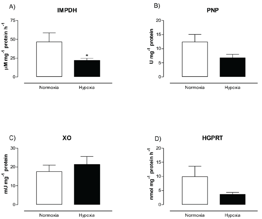 Figure 1 show the activity of IMPDH, PNP, XO and HGPRT from human skeletal muscle cells after normoxia and hypoxia conditions. IMPDH activity was significantly higher in normoxic (46.59 ± 11.95 µM mg-1 protein h-1) than hypoxic cells (22.09 ± 2.74 µM mg-1 protein h-1) (p < 0.036). There were no significant differences in PNP, XO and HGPRT activities between treatments (p > 0.05).