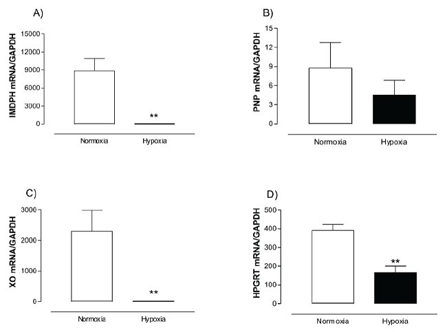 Abstract: Mammals experience some degree of hypoxia during their lifetime. In response to hypoxic challenge, mammalian cells orchestrate specific responses at transcriptional and posttranslational level, which lead to changes in purine metabolites in order to cope with threatening conditions. The aim of this study was to evaluate the response of the enzymes involved in purine metabolism at human muscle cells under hypoxic conditions. Muscle cells in culture were exposed to hypoxia and the enzymatic activity of inosine monophosphate dehydrogenase (IMPDH), xanthine oxidase (XO), purine nucleoside phosphorylase (PNP) and hypoxanthine guanine phosphoribosyl transferase (HGPRT) as well as their transcript expression were quantified under normoxic and hypoxic conditions. Purine metabolite (hypoxanthine (HX), xanthine (X), uric acid (UA), inosine monophosphate (IMP), inosine, nicotinamide adenine dinucleotide (NAD+), adenosine, adenosine monophosphate (AMP), adenosine diphosphate (ADP), adenosine triphosphate (ATP), guanosine diphosphate (GDP) and guanosine triphosphate (GTP)) concentrations were also quantified. Significant reduction of IMPDH activity as well as in HX and IMP concentrations (p < 0.05) were observed after hypoxia, suggesting a decrease in the purines de novo synthesis. After hypoxia a global reduction of transcripts was observed, suggesting a reduction of the metabolic machinery of purine metabolism to new steady states that balance ATP demand and ATP supply pathways.