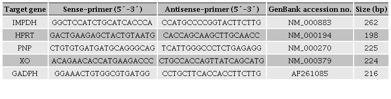 Determination of relative mRNA expression of IMPDH, XO, HGPRT and PNP was performed by real-time PCR, using the ABI 7000 Real Time PCR (Applied Biosystems). cDNA was diluted (1:5) and analyzed using the QuantiTect® SYBR® Green PCR Kit (204145, Qiagen). The reaction mixture contained 10 µL of SYBR® Green, 1.0 µL of forward and reverse primers (10 µM each), 5.0 µL of cDNA (50 ng), and 4.0 µL of sterile, distilled water. Controls without template were included to ensure absence of contaminating DNA. PCR reactions were carried out as follows, an initial cycle at 95°C for 15 min to activate the HotStarTaq® DNA polymerase, followed by the denaturalization of the cDNA at 94°C for 15 s, 40 cycles at 94°C for 15 s each, 60°C for 30 s, and 72°C for 30 s. The specificity of each primer set was validated by the construction of a melting curve, constructed after PCR by increasing the temperature from 75°C to 95°C at a rate of 0.3°C every 20 s. The expression of glyceraldehyde-3-phosphate dehydrogenase (GAPDH) mRNA was determined as housekeeping gene. The relative expression of target mRNA was normalized to the amount of GAPDH in the same cDNA using the standard curve method. Amplification efficiency for each analyzed gene was ~98%, using dilution from 0.25 x 10-2 ng µL-1 to 0.25 x 10-6 ng µL-1 of PCR fragments. Each RT-PCR data point is average of three independent biological replicates. Primer sequences and accession numbers for the housekeeping gene GAPDH and for the different enzyme genes are included in Table 1.