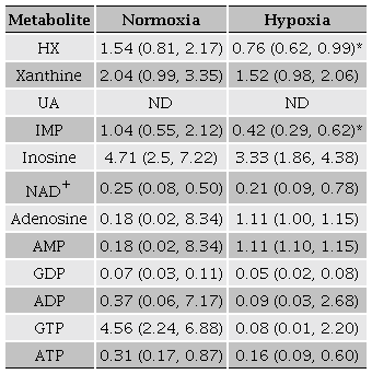 The analysis of the purine metabolites showed a significant increase in HX content, which correlates with the low activity of XO observed. These results correlated with previous findings in adipocyte tissues exposed to hypoxia, which showed an increase in HX and acid uric secretion during prolonged hypoxia (Nagao et al., 2018). The significantly reduction of IMP concentration in this study, might be related to an active uptake of this compound by IMPDH, as has been shown in other mammalian tissues, including erythrocytes, placenta, liver and heart (Traut, 1994; Pérez-Milicua et al., 2015).