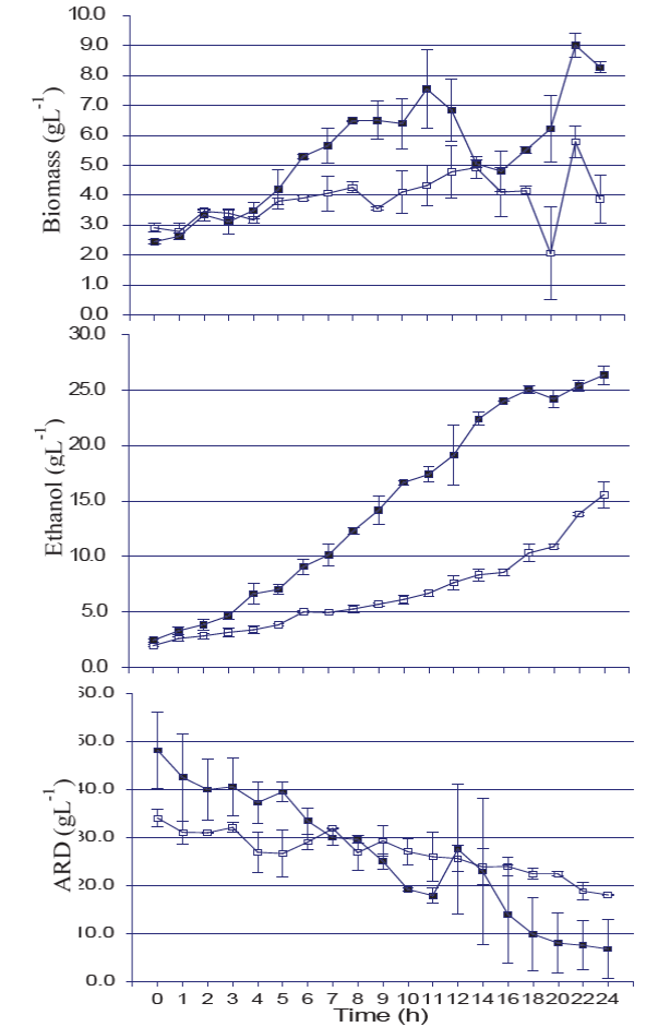 Di Serio et al. (2003) evaluated bakery yeast on YEPD medium, and other medium made with molasses and different salts, reporting different results with respect to this study. Values reported by Di serio et al. (2003) on the maximum growth rate (1.26 ± 0.11 per h) and biomass yield per substrate consumption (0.723 ± 0.069 g/g), are higher than our results. This means that the YEPD medium and the molasses are more complete than the agave juice, or that the agave juice has inhibitors that affect the yeast, like some maillard compounds produced in the agave cooking, such as furfural. On the other hand, the results obtained are encouraging because the Bacanora producer obtained less than 20 g/L of ethanol in their fermentations, and in longer time with mixed S. cerevisiae cultures the production was 27.5 % higher.