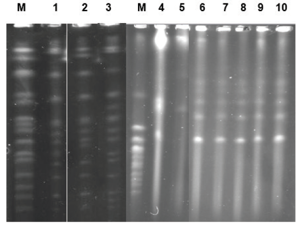 Biomass concentration was estimated by total count using a Neubauer chamber or dry weight. Total reducing sugar was determined in previously hydrolyzed ferment yeast-free must by DNS method (Miller, 1959). Viability was estimated after dying cells with methylene blue (Díaz-Montaño et al., 2008; Segura-García et al., 2015). Ethanol concentration was determined using an enzymatic method measurement in an YSI biochemical analyzer 2700 (Yellow Spring Instrument). Karyotype technique was determined by pulsed clamp electrophoresis (PFGE) according to Alvarez-Ainza et al., (2015) with some modifications, using the zymoliase-20T enzyme at the first step of the process to degrade the cell wall (25 µg/mL, Seikaguru Corporation). S. cerevisiae YPH80 was used as molecular weight (Molecular Weight log Biolabs Inc.). The gel was stained with ethidium bromide and photograph with a GelDoc camera (BioRad).