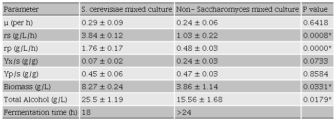 The Saccharomyces mixed culture (S. cerevisiae key 46, S. cerevisiae 591 and S. cerevisiae 1101) was more efficient than non-Saccharomyces (Torulaspora delbrucekii key 1227, Pichia membranefaciens key 807 and Kluyveromyces marxianus key 251) to produce ethanol. The first produced up to 25.51± 1.19 g/L with a volumetric productivity of 1.76±0.17 g/L/ h, while non-Saccharomyces strains produced 15.56 ± 1.68 g/L of ethanol with a volumetric productivity of 0.484±0.06 g/L/h. The kinetic parameter evaluated in the fermentations on this study, indicates the degree of adaptation of the microorganisms to the culture. The yeasts in mixed cultures were able to grow and achieve transformation of sugars into ethanol; it should be noted here that in the case of mixed cultures, there is also competition between the inoculated strains and the best adapted will be the predominant.