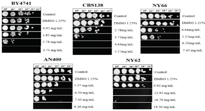 Los cultivos se incubaron a 28°C con agitación continua a 120 rpm durante 7 h en medio nuevo (fase logarítmica de crecimiento) o durante 3 h en medio recuperado de fase estacionaria (fase estacionaria de crecimiento), transcurrido el tiempo de incubación se determinó la densidad óptica y se ajustó a OD 600nm 0.5 en 1 mL de agua destilada estéril, posteriormente se lavaron las células y se centrifugaron a 13,000 rpm durante 30 s y se realizaron ensayos de microdilución (Cuéllar-Cruz et al., 2008) en placas de 96 pocillos y una alícuota de 180 µL se colocaron en cajas de petri con medio YPD agar durante 48 h.