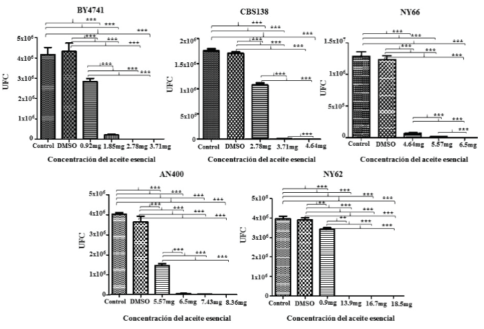 Los análisis estadísticos indican que entre el control sin diluyente y el que tenía DMSO al 1.25 % no hay una diferencia estadísticamente significativa, por lo cual, el diluyente no afecta el crecimiento de las células. Un dato importante es que en todas las cepas hubo diferencia entre los controles y las concentraciones de aceite esencial de C. mexicana probados. Aunque para la cepa de S. cerevisiae, el aislado NY66 y el aislado NY62, la segunda concentración utilizada, ya no muestra diferencias estadísticas respecto a la concentración anterior probada (Figura 4).