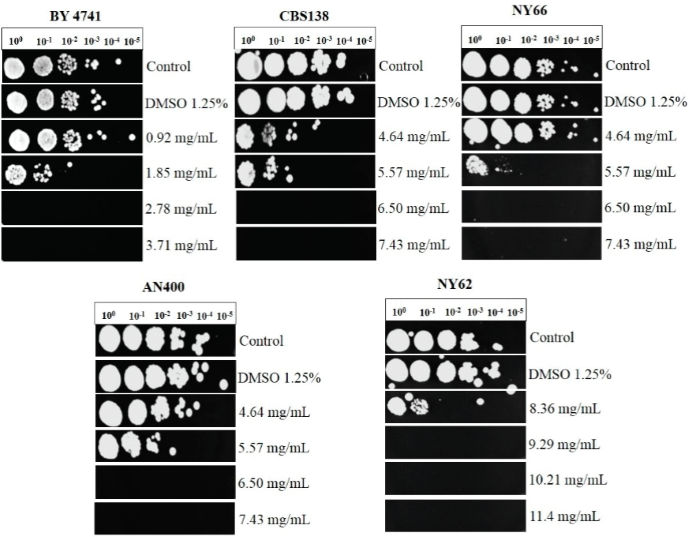 Para la cepa de S. cerevisiae la CMI fue de 3.71 mg/mL, esta concentración es menor respecto a la utilizada en las cepas de C. glabrata. Para las cepas CBS138, NY66, AN400 y NY62 la CMI fue de 4.64 mg/mL, 6.5 mg/mL, 8.36 mg/mL y 18.5 mg/mL respectivamente (Figura 1).