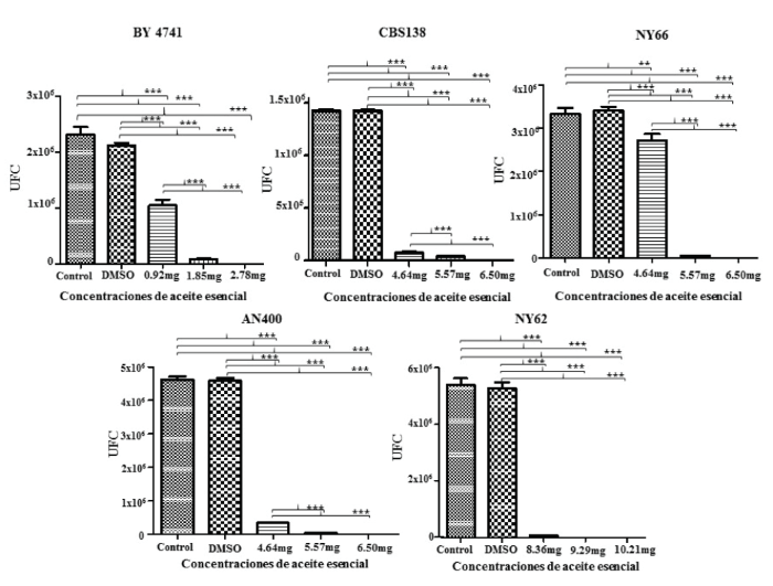 Con base en el conteo de UFC, se realizó la prueba estadística de ANOVA para determinar la diferencia de las medias de las cepas utilizadas con las distintas concentraciones de aceite esencial en la fase logarítmica de crecimiento. Se observa que en todas las cepas utilizadas hay una diferencia estadísticamente significativa (p=0.001) entre los controles con la CMI determinada por el crecimiento sobre agar sólido. En los controles sin y con diluyente no hay diferencia estadística (Figura 2).