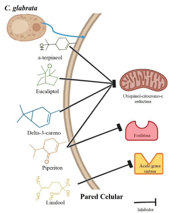 La piperitona se encontró que actúa como un inhibidor de la enzima fosfatasa, la vía de transducción del fosfato en C. glabrata es similar que la de S. cerevisiae, esta ruta es esencial para sobrepasar la inanición (Orkwis et al., 2010). El linalool funciona como un posible inhibidor de la ácido grasa sintasa, la cual es muy importante porque está implicada en la síntesis de ácidos grasos de la pared celular. La cantidad de ácidos grasos sintetizados varía de acuerdo a las condiciones de crecimiento del microorganismo, además, en los hongos la síntesis de novo de ácidos grasos sucede en el citosol o en las mitocondrias (Roche et al., 2013).