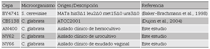 Agradecemos amablemente a la Dra. Irene Castaño Navarro y al Dr. Alejandro De las Peñas Nava del Instituto Potosino de Ciencia y Tecnología por su apoyo en la donación de las distintas cepas de C. glabrata utilizadas en esta investigación. L.G. agradece el apoyo técnico de Mónica Navarro.