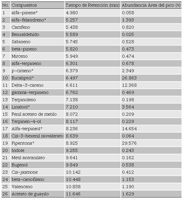 La composición química del aceite esencial de C. mexicana se muestra en la Tabla 2, en donde se identificaron 26 compuestos. El aceite se caracterizó por la presencia mayoritaria de cinco compuestos: piperitona (29.58 %), eucaliptol (26.86 %), α-terpineol (14.65 %), delta-3-careno (12.37 %) y linalool (3.56 %).
