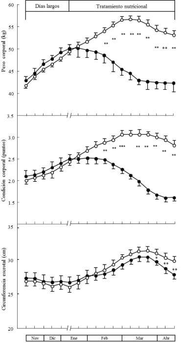 Estos resultados sugieren que, a pesar de que los días largos artificiales son efectivos para inducir la actividad sexual de los machos durante el periodo de reposo sexual, una reducción de un 25% de sus necesidades nutricionales proporcionada al finalizar el tratamiento de luz, afectó el comportamiento sexual de los machos, y redujo considerablemente las características cualitativas y cuantitativas del semen. Sin embargo, la alimentación de los machos por arriba de sus necesidades nutricionales (120%), mejoró notablemente el comportamiento sexual y las características del semen.