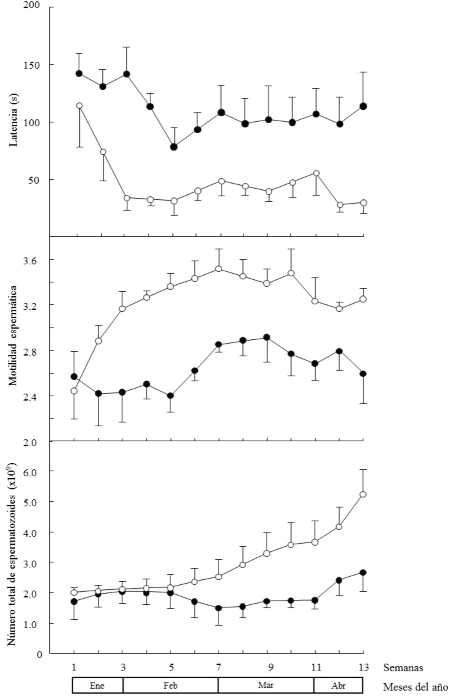 El volumen de eyaculado promedio fue mayor en los machos del grupo G-120, que en el grupo G-75 (P < 0.001; Tabla 2). Además, el efecto del nivel nutricional sobre el volumen de eyaculado difirió dependiendo del tiempo de estudio (P < 0.001). A partir de la segunda semana de marzo y hasta finalizar el estudio, el volumen de eyaculado fue más alto en los machos del grupo G-120 (1.0 ± 0.1 mL), que el obtenido en el grupo G-75 (0.5 ± 0.05 mL).