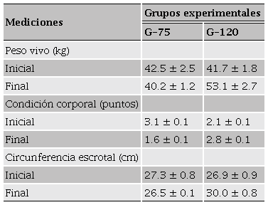 La concentración espermática promedio (espermatozoides/mL) fue mayor en el grupo G-120, que en el grupo G-75 (P < 0.01; Tabla 2). Además, la concentración espermática varió a través del tiempo (P < 0.01; Figura 2). Ninguna interacción fue encontrada entre el nivel nutricional y el tiempo de estudio sobre la concentración espermática (P > 0.05).