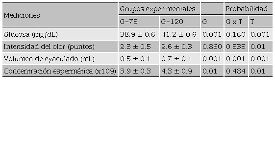 La motilidad espermática progresiva promedio fue más alta en los machos del grupo G-120 (3.2 ± 0.1) que la obtenida en el grupo G-75 (2.6 ± 0.1; P < 0.001). En ambos grupos, la motilidad incrementó a través del tiempo (P < 0.001; Figura 2). Ninguna interacción fue encontrada entre el tratamiento nutricional y el tiempo sobre la motilidad espermática (P > 0.05).