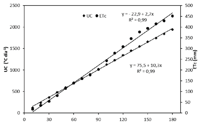 Donde: Ev = evaporación del tanque A; Ke = coeficiente para el evaporímetro (0.6); y Kc = coeficiente del cultivo (0.8 para girasol). Así mismo se calculó las unidades calor (UC, °C d), mediante el método residual de Flores et al. (1985) , el cual es descrito por la siguiente ecuación: