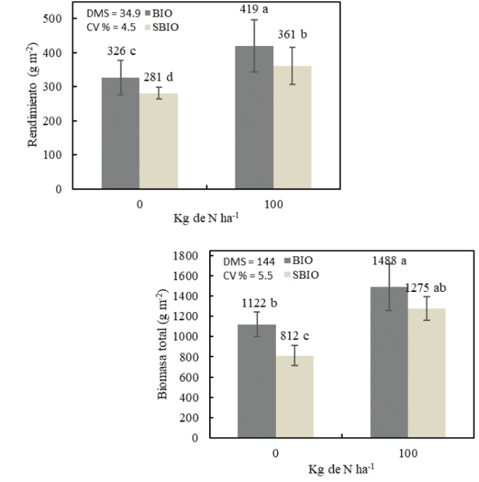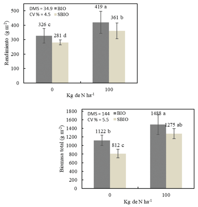 Para la combinación de N x BIO (Figura 5), se observó que al aplicar de 100 kg ha-1 de nitrógeno la producción de biomasa total y rendimiento de grano se incrementó en un 57 y 28 % respecto a la nula fertilización, al incorporar el biofertilizante en los tratamientos con nitrógeno, se logró que la biomasa total y rendimiento de grano aumentara en un 21 y 26 % más, respecto a la fertilización de 100 kg ha-1de nitrógeno, valores semejantes registraron Jalilian et al. (2012) , donde indican que con la aplicación del biofertilizante se promueve el crecimiento de la planta de girasol, lo que genera una mayor biomasa total y rendimiento de grano. Por su parte Madhurendra et al. (2009) , mencionan que con la aplicación de 100 kg de N ha1 + Azospirillum y Azotobacter se eleva el rendimiento de grano en comparación a solo la fertilización nitrogenada.