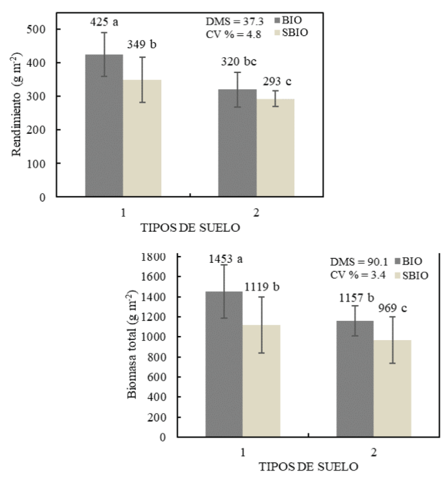 En la interacción S x N x BIO (Tabla 3), se percibió que la mayor BT y RG se registró con la aplicación de N (100 Kg ha-1) y biofertilizante, siendo más evidente en el Suelo 1, ya que la producción fue 20 y 26 % mayor a la del Suelo 2. El RG más alto está relacionado con el P100S y AC, componentes que mostraron un efecto positivo con el uso del biofertilizante en condiciones menos salinas (Prabhaharan et al., 2019). Cabe indicar, que el biofertilizante se vio favorecido por las condiciones del suelo en las que se desarrolló el cultivo. Esto señala, el hecho de que suelos con una mayor salinidad limitan el crecimiento de las plantas, incluso podría causar la muerte de está. Los efectos estimulantes de los microorganismos están relacionados con la producción de fitohormonas, que pudieran estimular la absorción de nutrientes y agua, lo que conduce a un mayor crecimiento y rendimiento de las plantas (Madhurendra et al., 2009; Jalilian et al., 2012). En lo que respecta al IC, tanto el Suelo 1 como en el Suelo 2, la aplicación de solo el nitrógeno (100 kg ha-1) generó una mayor eficiencia en la acumulación de materia seca hacia el grano, ya que presentó los mayores porcentajes. Tendencias similares obtuvieron Aguilar et al. (2017) en el cultivo de maíz y encontraron que donde se aplicó nitrógeno el IC era más alto en comparación a las asociaciones entre nitrógeno y biofertilizantes.
