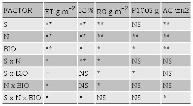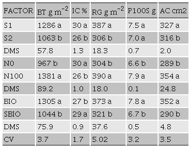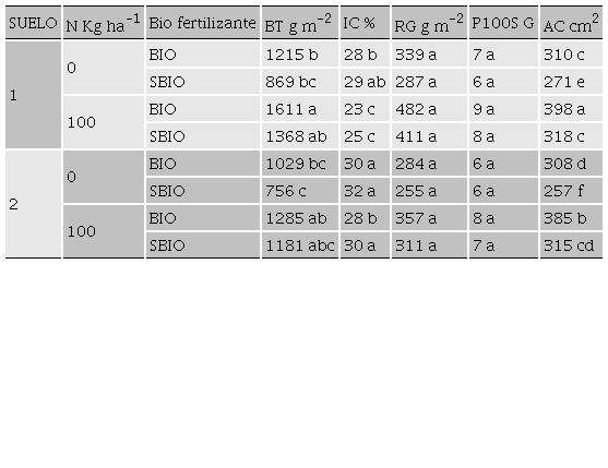 En el Tabla 1, se presenta el análisis de varianza de los factores de estudio y sus interacciones, en el cual muestra que la biomasa total (BT) y rendimiento de grano (RG) presentaron diferencias significativas para el suelo (S), nitrógeno (N), biofertilizante (BIO), S x N, S x BIO y N x BIO; mientras que en el IC se observó una nula significancia en las interacciones S x BIO y N x BIO. Con respecto al P100S la significancia se registró en el factor N, BIO y la interacción S x BIO, finalmente para AC no presentaron diferencias significativas las interacciones S x N, S x BIO y N x BIO.