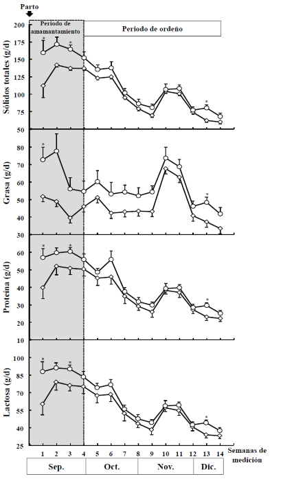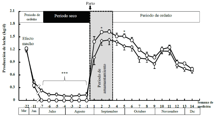La fecha promedio ± error estándar del promedio (±SEM) del parto para todas las cabras fue el 31 de agosto (± 1.0 día). Las crías se mantuvieron con su respectiva madre durante los primeros 21 días post-parto. Ellas fueron amamantadas libremente desde que sus madres regresaban del pastoreo hasta la mañana siguiente. Después del retiro definitivo de las crías, las cabras se ordeñaron una vez al día (a las 07:00 horas) hasta el final del experimento.