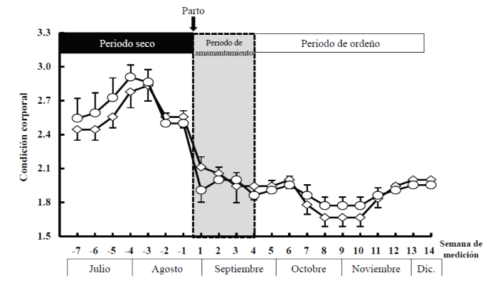 La CC en las cabras de ambos grupos en diferentes periodos del estudio se muestra en la Figura 3. No se encontró un efecto del tratamiento (P>0.05) sobre esta variable en ningún momento del estudio. Sin embargo, en ambos grupos esta variable mostró variaciones a través del tiempo (P<0.001). Aunque en el presente estudio la CC no fue afectada por el tratamiento, en vacas lecheras se ha reportado que las hembras que ganan CC durante el periodo seco producen más leche, grasa y proteína que aquellas que no ganan CC (Chebel et al.., 2018).