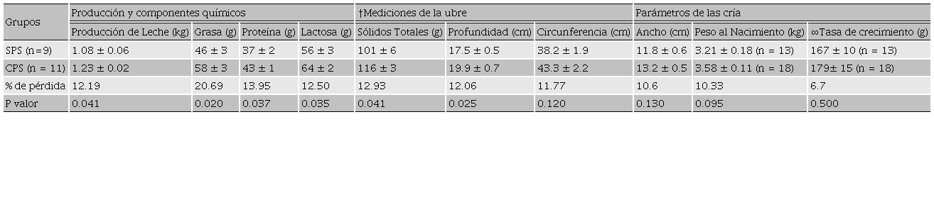 La tasa de crecimiento de las crías del grupo CPS fue mayor que el registrado en las crías del grupo SPS, aunque no hubo diferencia significativa (P>0.05; Tabla 1). Es probable que como se ha reportado previamente (García y González et al.., 2017) el peso de las crías está correlacionado positivamente con el nivel de producción láctea de las madres. En otras palabras, es posible que como las madres del grupo CPS produjeron mayor cantidad de leche entonces sus crías fueron más pesadas que en las del grupo SPS.