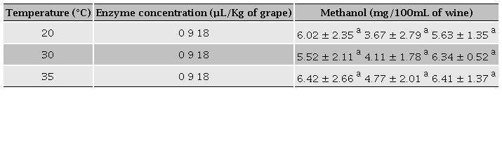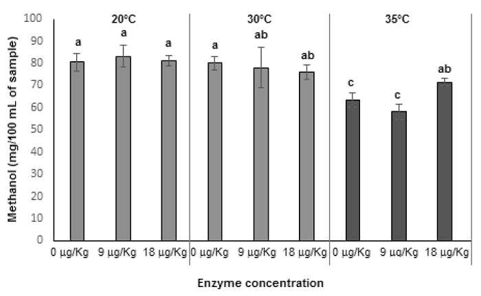 This transformation was used as a dependent variable instead of time; this transformation allowed us to compare the amount of methanol at any given fermentation progress since fermentation time was different for each temperature. All fermentation showed an exponential behavior, where the maximum concentration was achieved at the beginning of the fermentation and was maintained during the rest of the process. Final methanol concentrations (Figure 1) demonstrate that both, temperature and enzyme concentration, exert an effect on this variable. The lowest concentrations were obtained at 35 °C with no addition of pectic enzyme, while the highest were at 20 °C; however, no significant differences were observed among methanol concentrations obtained at 30 °C. The effect of enzyme addition is only significant at 35 °C, this might be due to the fact that Saccharomyces cerevisiae exerts its highest activity at 37 °C (Mesonides et al., 2002) and can produce pectinesterase enzyme. This specific enzyme has a higher optimum temperature than commercial enzymes (Jayani et al., 2005), and this production could be enough to promote an increase in methanol generation.