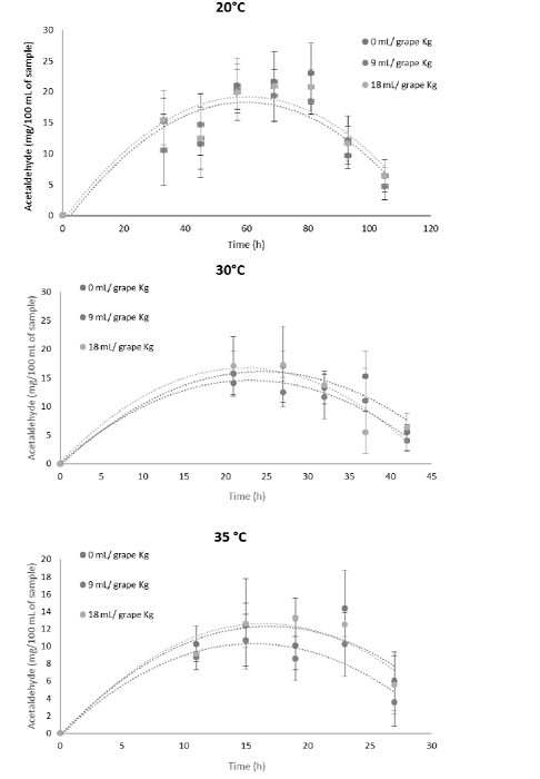 In order to monitor fermentation variables (alcohol volume (%), methanol, and acetaldehyde), samples were taken every 12, 6, and 4 h for 20, 30, and 35 °C, respectively.