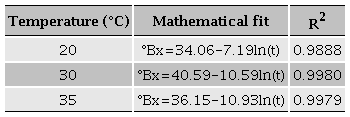 The initial amount of fermentable sugar, measured in °Brix, was within the range of 17.0 and 17.8; which were within the recommended range for wine (Vine et al., 2002). The reduction of fermentable sugar was periodically measured, depending on the temperature. Samples were taken every 6, 3, and 2 h. The mathematical fit of °Brix reduction was described with a natural logarithm, using time as the nondependent variable and °Bx as the dependent variable (Table 1); all mathematical fits described fermentation behaviors with high correlation values.