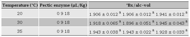 Alcohol content is expressed as alc/vol, mainly represents the production of ethanol, since this is the alcohol produced in the highest percentage and constitutes the main purpose of fermentation (Delfini and Formica, 2001). Alcohol production was dependent on sugar concentration, oscillating between 8.6 and 9.3 alc/vol; nonetheless, the amount °Bx necessary to increase 1 % the amount of alcohol did not show statistical difference among them (Table 2), showing that this variable is not temperature nor pectic enzyme dependent.