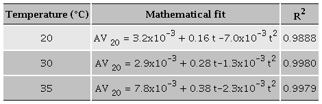 In order to describe the fermentation process, mathematical fits were calculated for every temperature, associating the amount of alcohol produced (alc/vol) to the fermentation time (Table 3).