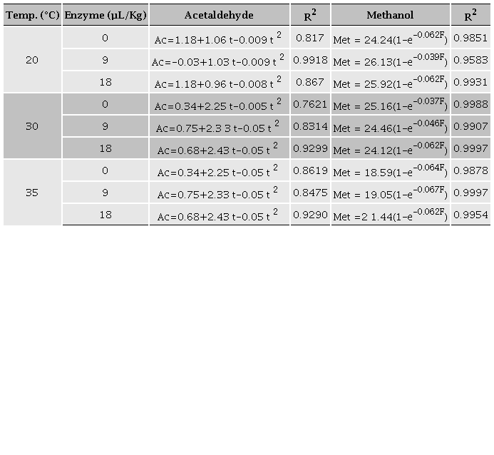 Considering this information, this study aimed to mathematically determine the effect of time, temperature, and pectic enzyme used, on methanol and acetaldehyde production.