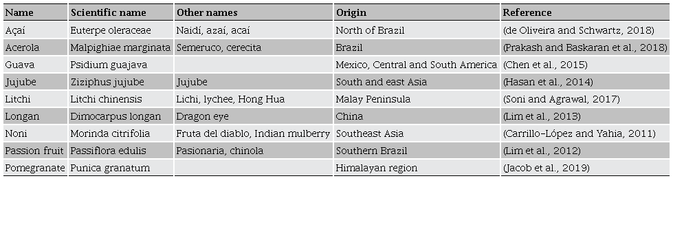 The most widely consumed tropical fruits, such as avocado (Persea americana), mango (Mangifera indica), papaya (Carica papaya) and pineapple (Ananas comosus), have reached significant commercial success. They are available practically all year in areas with temperate climates (FAO, 2018). Other fruits such as açaí (Euterpe oleraceae), acerola (Malpighia emarginata), guava (Psidium guajava), jujube (Ziziphus jujuba), litchi (Litchi chinensis), longan (Dimocarpus longan), noni (Morinda citrifolia), passion fruit (Passiflora edulis) and pomegranate (Punica granatum), are strugling to find market sale sites since these fruits are imported from traditional producing countries. However, these fruits are increasingly in demand in international markets for their characteristic flavor, high nutrient content and variety of bioactive compounds such as phenolic acids, flavonoids, carotenoids and fiber (Enriquez-Valencia et al., 2020).