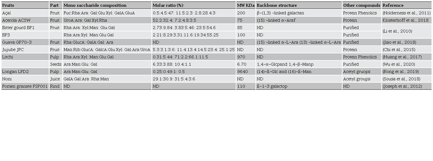 For the above mentioned, it is necessary to carry out more in-depth studies to characterize polysaccharides of tropical fruits and their by-products, and the relationship of their structure with different biological activities.