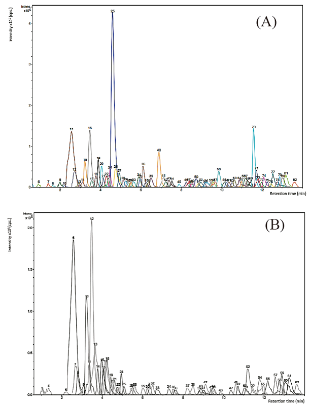The characterization of organic extracts (OE) from P. durangensis and Q. sideroxyla was by the analysis of the major peaks identified based on elution order, and that of all compounds was by interpreting their mass spectra obtained by the HPLC-ESI-MS, considering previously reported data. Figure 1 (A and B) shows the total ion chromatogram (TIC) of extracts from species studied. Several investigations reported cytotoxic effects of some Pine and oaks species on different cell lines that were related to compounds with the biological activities (Şöhretoğlu et al., 2012; Moradi et al., 2016; Li et al., 2016; Yang et al., 2016; Amessis-Ouchemoukh et al., 2017; Sarmeili et al., 2017).