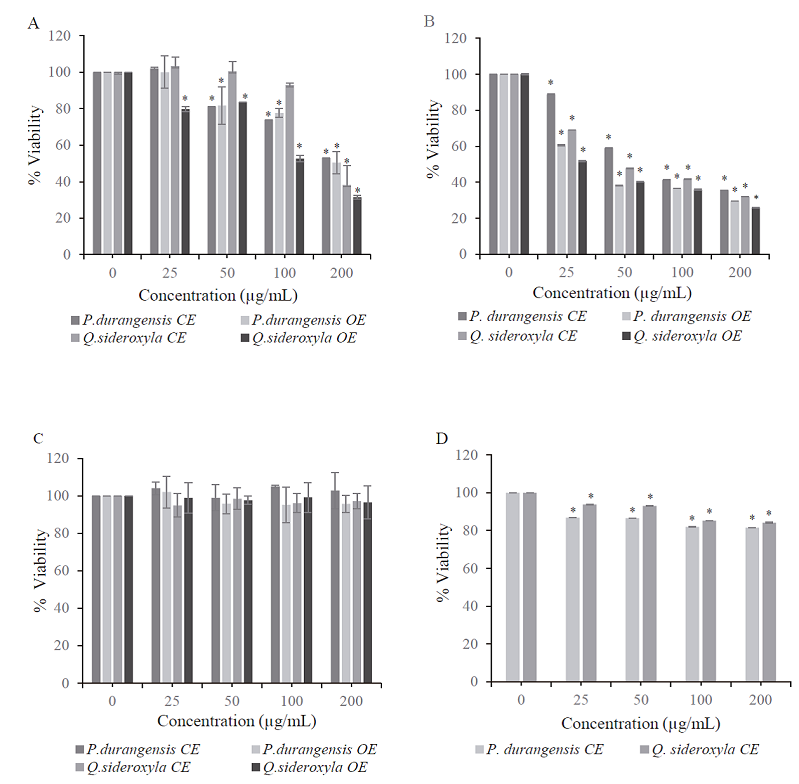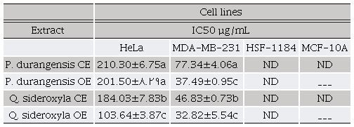 The P. durangensis and Q sideroxyla CE and OE bark cytotoxic effects were also evaluated on a cell line from human breast carcinoma, estrogen receptor-negative (ER-) MDA-MB-231, and cervix carcinoma cell line HeLa. Non-tumorous MCF-10A and HSF-1184 cells, used as controls, allowed comparing the effects produced by the extracts in healthy and tumor cells.