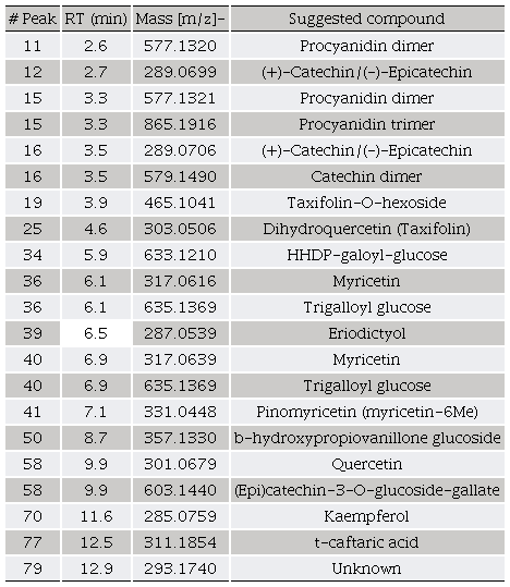 Table 1 shows the main constituents of pine bark, where the compounds of the peaks 11, 12, 15, 16, 25, 36, 40, 41, and 58 coincide with compounds recently reported by Rosales (2017) in P. durangensis bark, demonstrating the presence of flavonoids like procyanidins and the abundance of taxifolin. Other TIC peak constituents were compared with the relevant literature in order to obtain a tentative identification (most studies on compounds of Pinus and Quercus bark) finding: kaempferol and eriodictyol ([M-H]- 285 and 287 respectively; De la Luz Cádiz-Gurrea et al., 2014), taxifolin-o-hexoside ([M-H]- 465; Cretu et al., 2013), β-hydroxypropiovanillone glucoside ([M-H]- 357; Karonen et al., 2004), HHDP-galoyl-glucose ([M-H]- 357; Fernández et al., 2009), trigalloyl glucose ([M-H]-635; Mucilli et al., 2017), (Epi)catechin-3-O-glucoside-gallate ([M-H]- 603; Jiménez-Sánchez et al., 2015), t-caftaric acid ([M-H]- 311; Pardo-García et al., 2014).